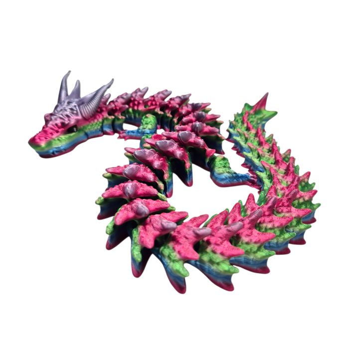 Shadowcoil Dragon este un model articulat 3D inspirat din estetica dragonilor orientali, construit din segmente flexibile care îi permit mișcări line și realiste. Imprimeul multicolor pune în evidență detaliile corpului: crestele dispuse pe coloană, textura solzilor și capul modelat cu coarne fine. Designul este gândit pentru manipulare ușoară, astfel încât utilizatorul poate schimba forma corpului și poate crea poziții variate. Modelul este printat în PLA, un material biodegradabil folosit frecvent la jucării și obiecte decorative realizate prin imprimare 3D.