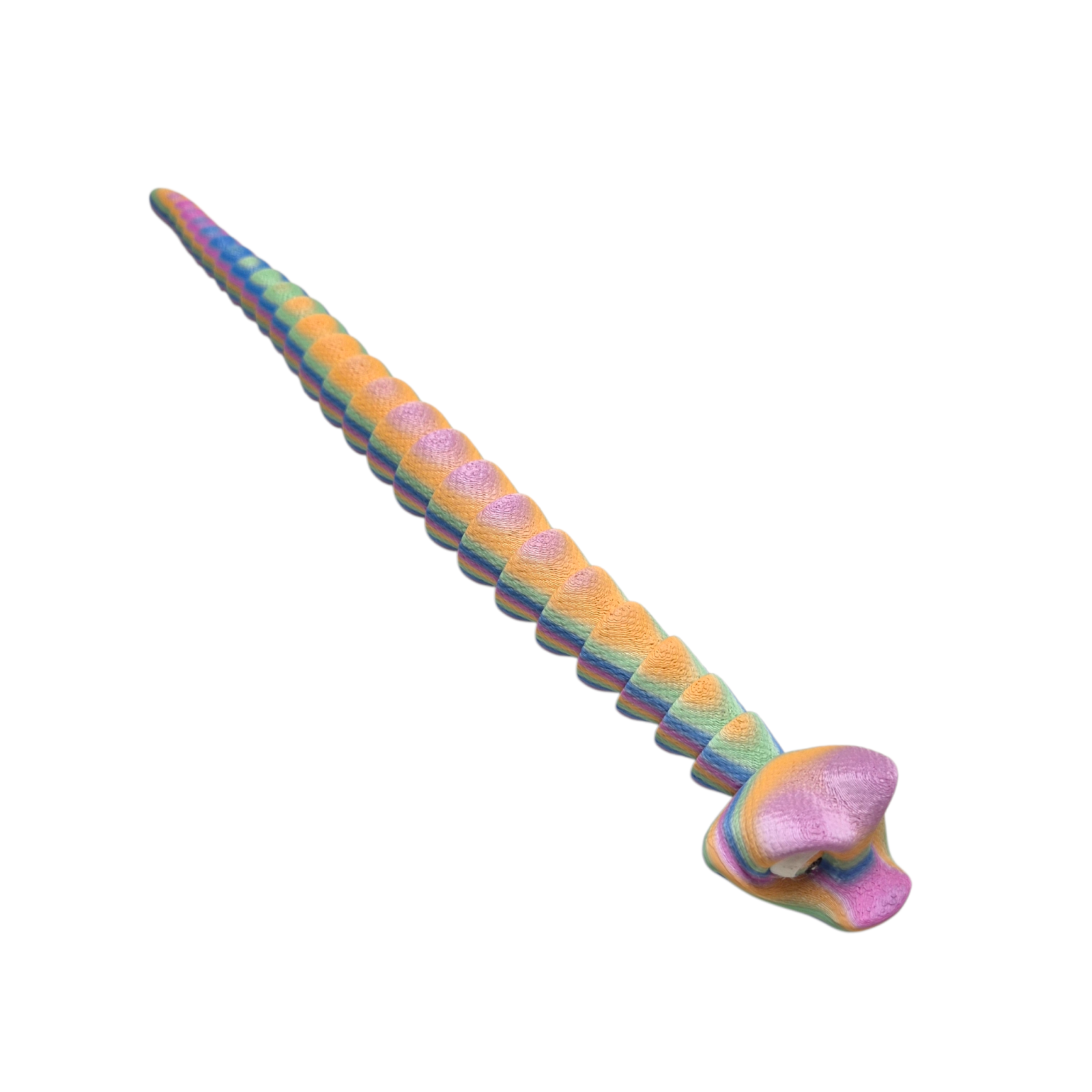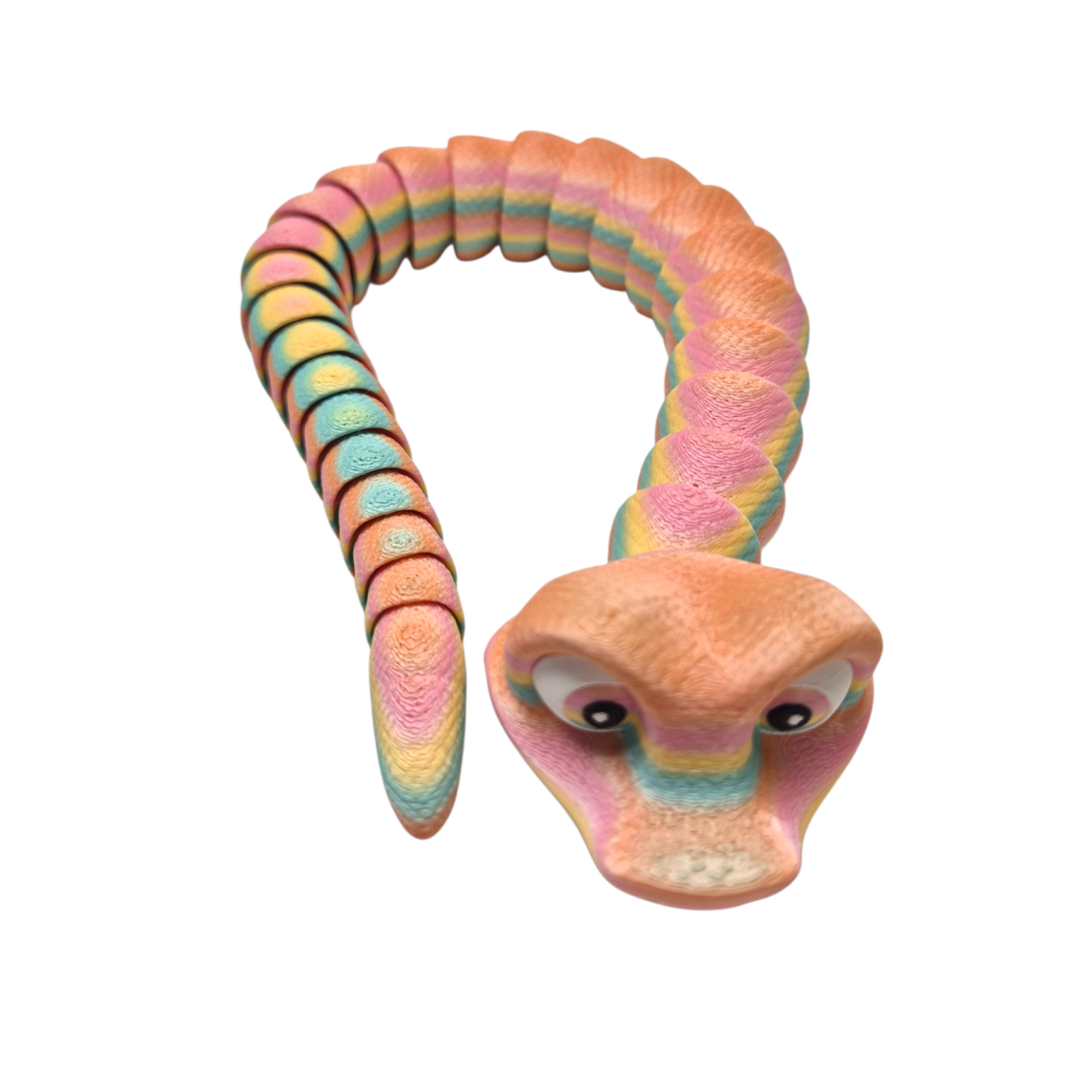 Șarpele Articulat Rainbow Flex este o jucărie imprimată 3D, colorată în degradeuri pastelate. Segmentele articulate permit mișcări fluide, iar textura specifică îl face plăcut la manipulare. Copiii îl pot încolăci, ondula sau mișca liber, iar forma expresivă a capului îl face atractiv pentru joc creativ.