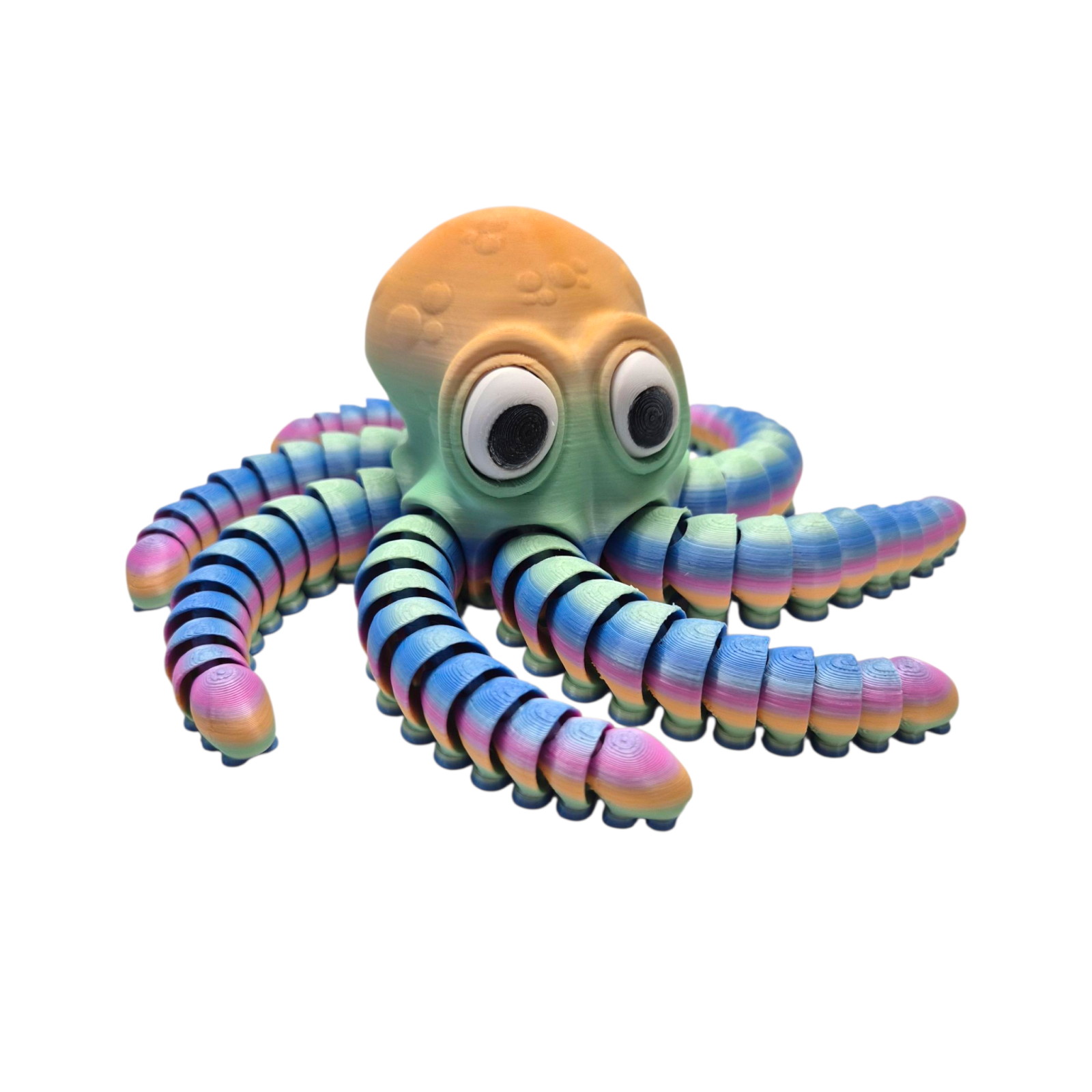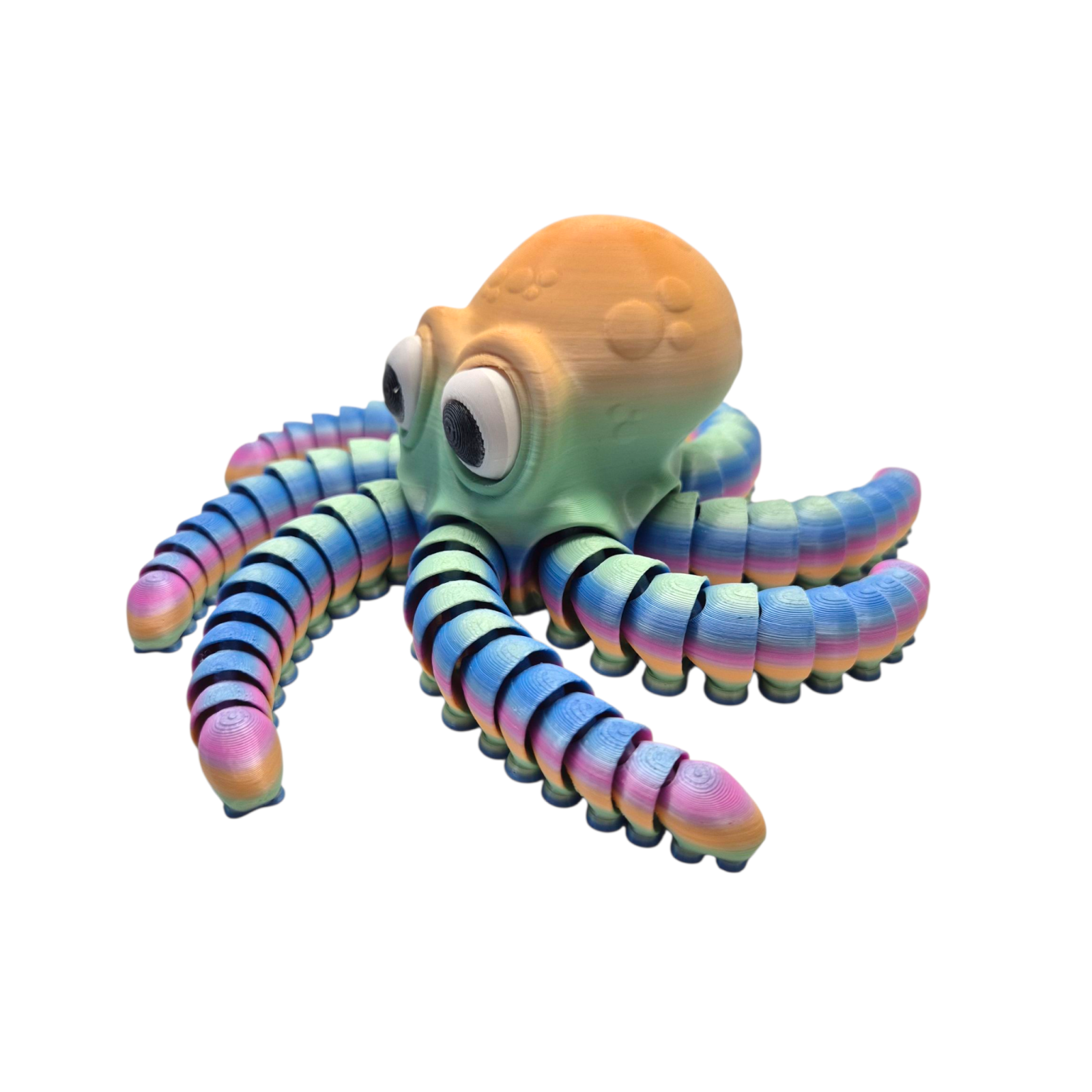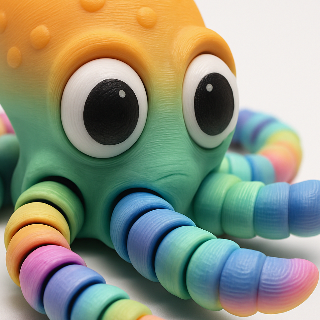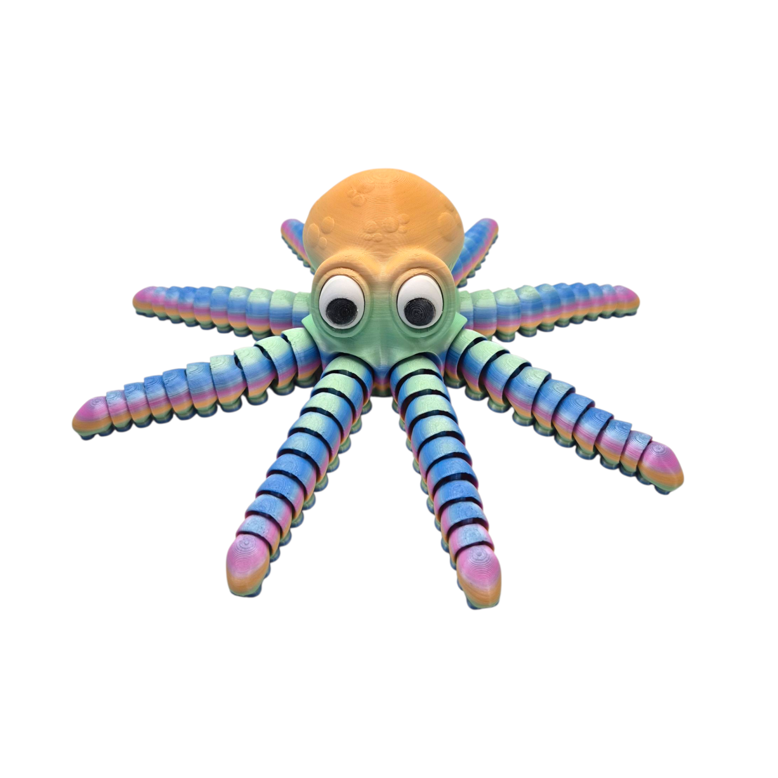 Caracatița articulată printată 3D este o jucărie flexibilă și colorată, realizată din PLA, un material sigur și ușor. Designul ei include opt brațe segmentate, construite astfel încât să se miște natural în toate direcțiile. Fiecare segment permite manipularea ușoară, ceea ce face figurina potrivită pentru joacă, relaxare tactilă și dezvoltarea coordonării mâinilor.