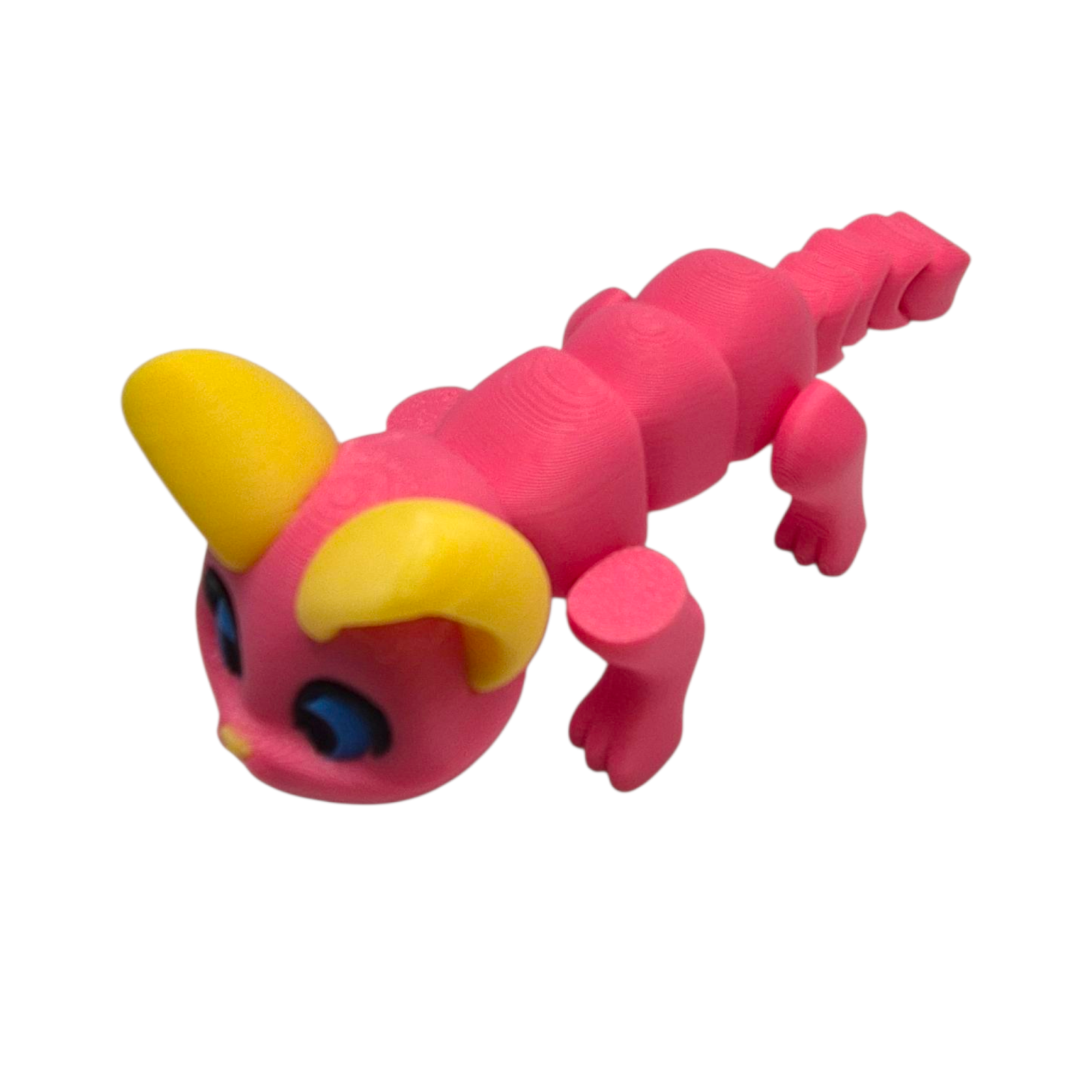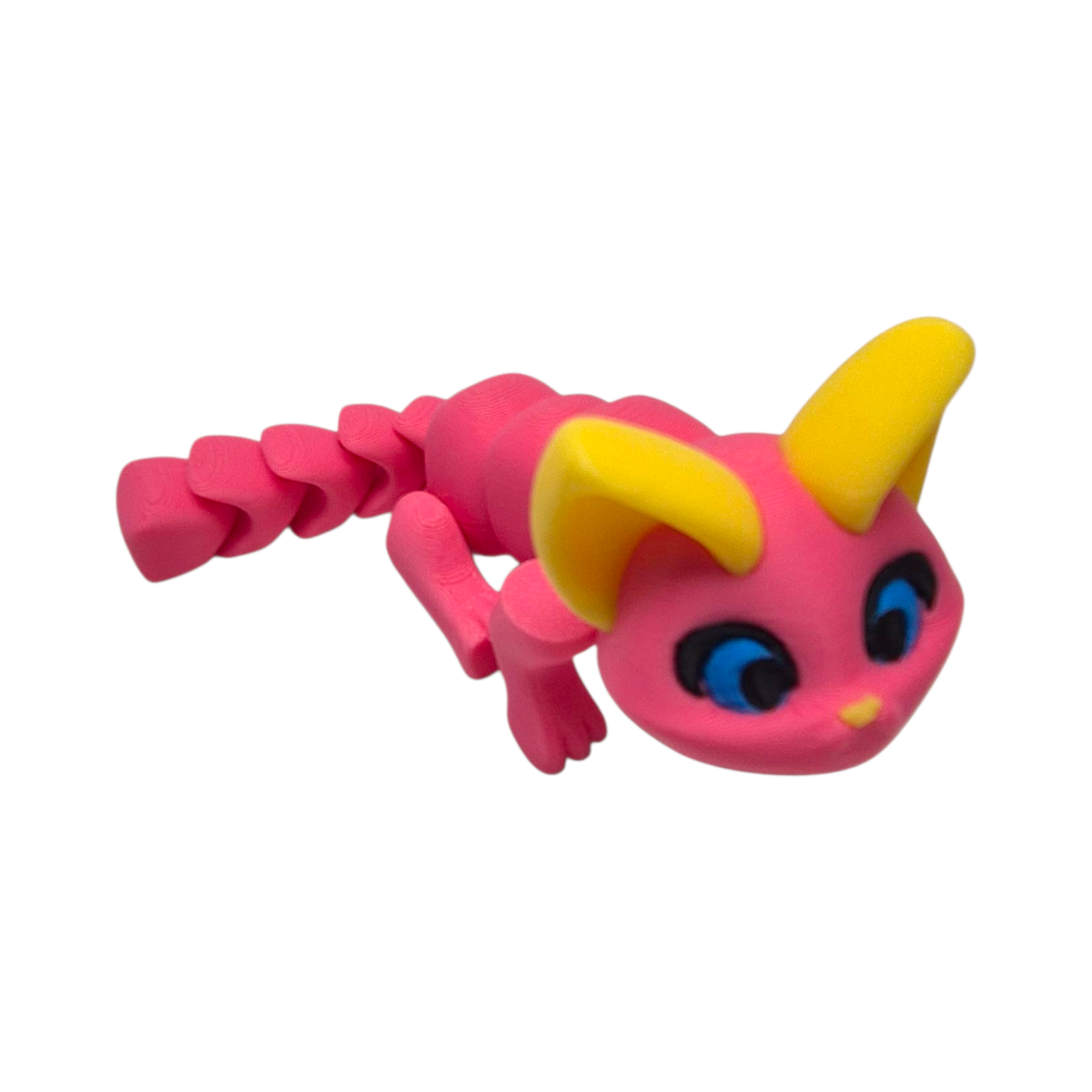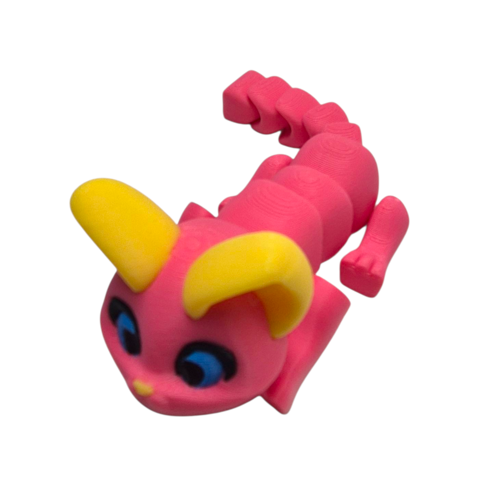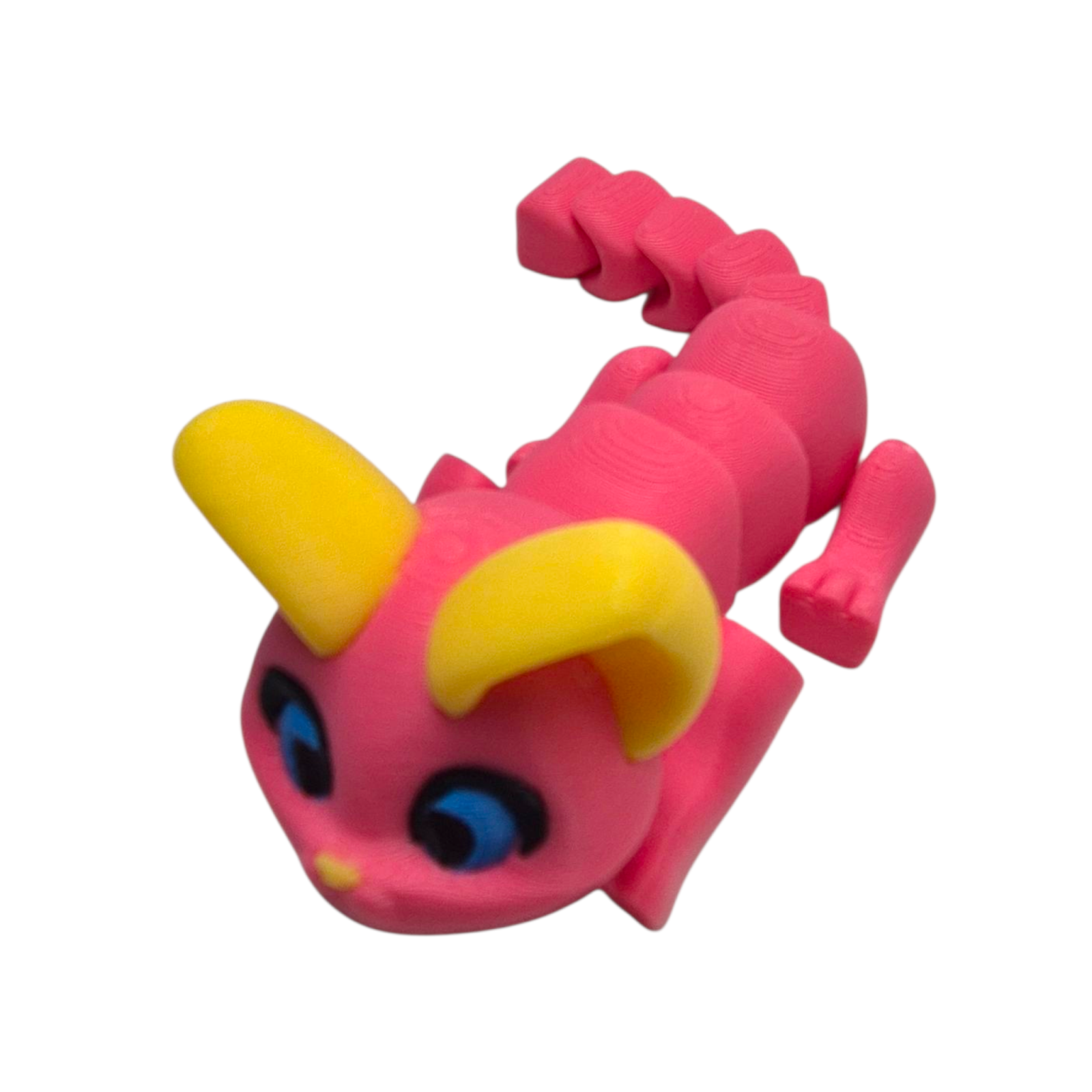 Pisicuța Flex Roz este o figurină articulată 3D concepută special pentru copiii de peste 5 ani, oferind o experiență de joacă plăcută și sigură. Modelul are un design unic, cu o expresie prietenoasă, coarne galbene accentuate și o coadă segmentată flexibilă, ușor de manipulat. Fiecare element este imprimat cu precizie din PLA biodegradabil, un material non-toxic, potrivit pentru utilizarea zilnică și rezistent la mișcări repetate.