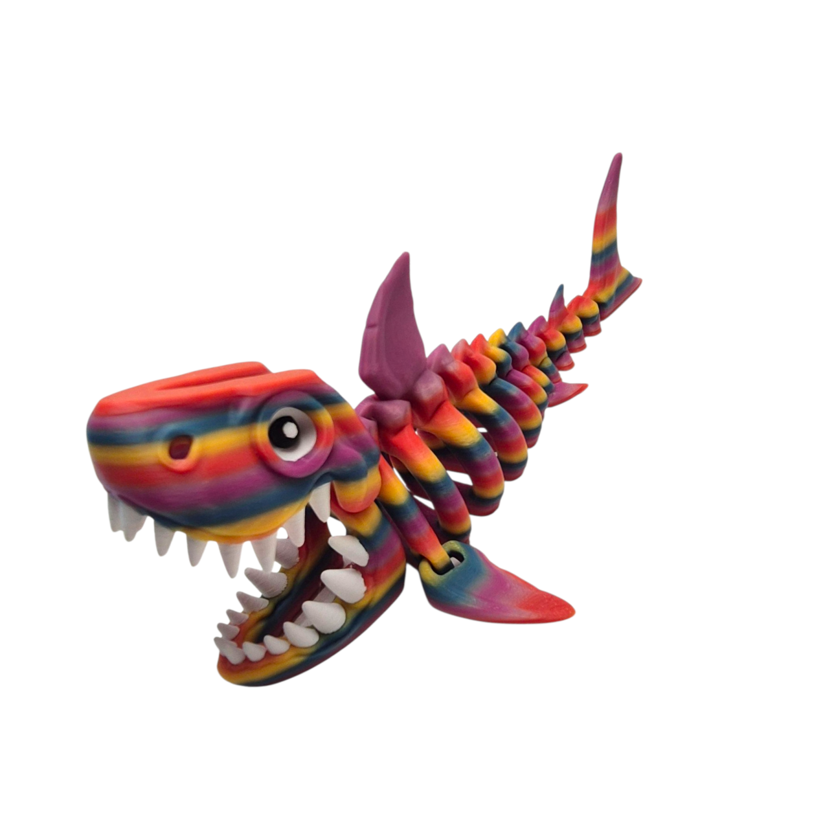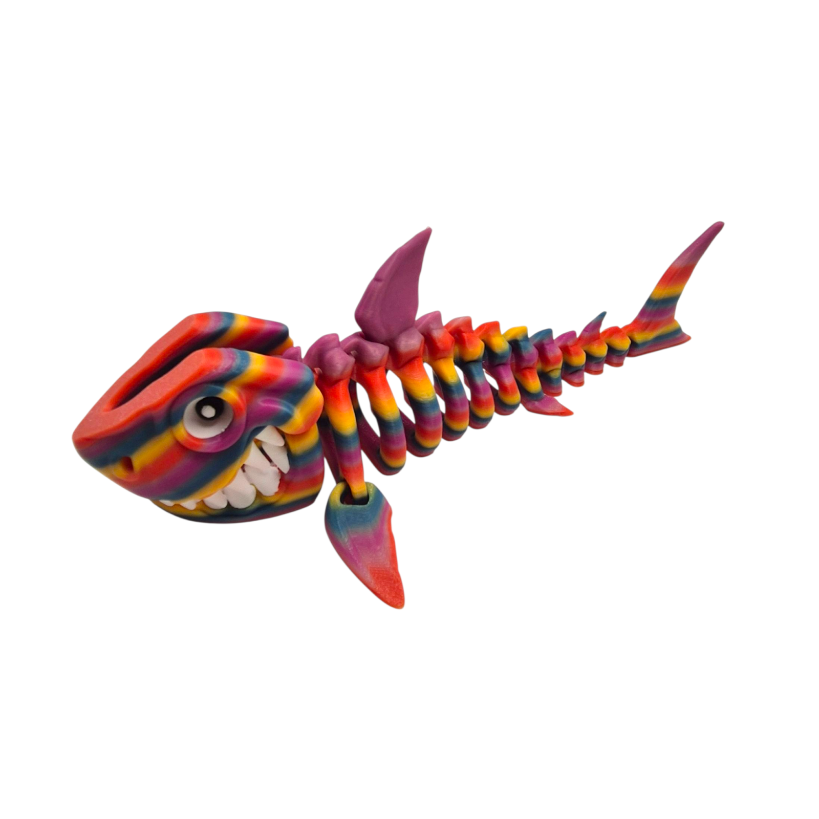 Scheletul Rechin Articulat 3D este o jucărie flexibilă imprimată din PLA, creată pentru copiii de 5 ani și peste, care iubesc modelele dinamice și personajele cu aspect fantezist. Figurina are o structură inspirată din forma unui schelet stilizat de rechin, dar păstrează un aspect prietenos datorită expresiei jucăușe și culorilor vibrante. Variantele disponibile includ modele în nuanțe curcubeu sau metalice, fiecare exemplar fiind unic datorită procesului de imprimare 3D.