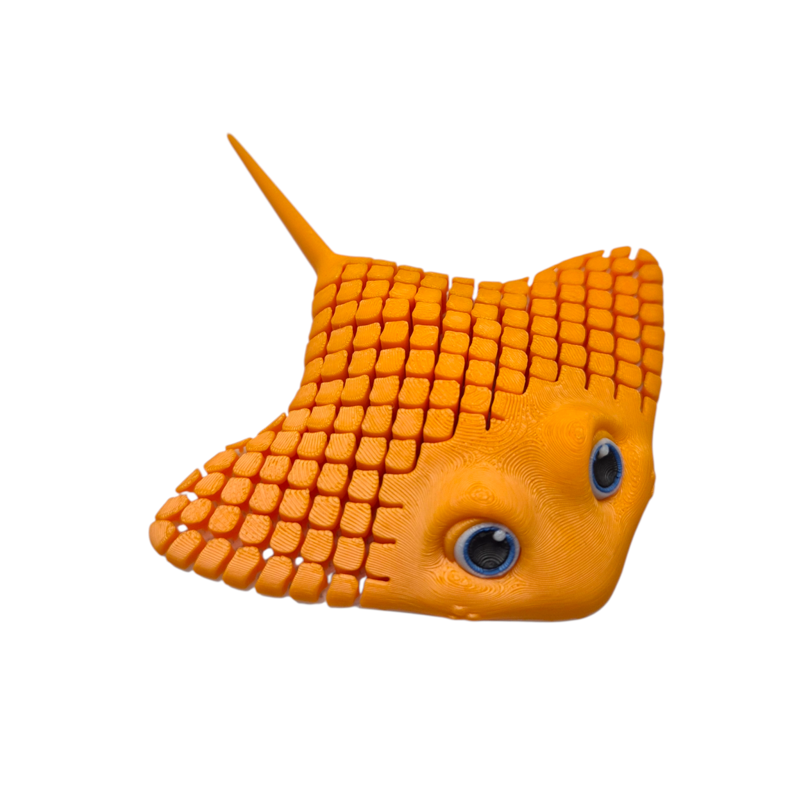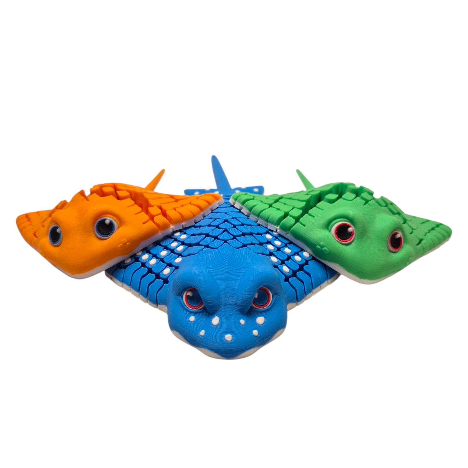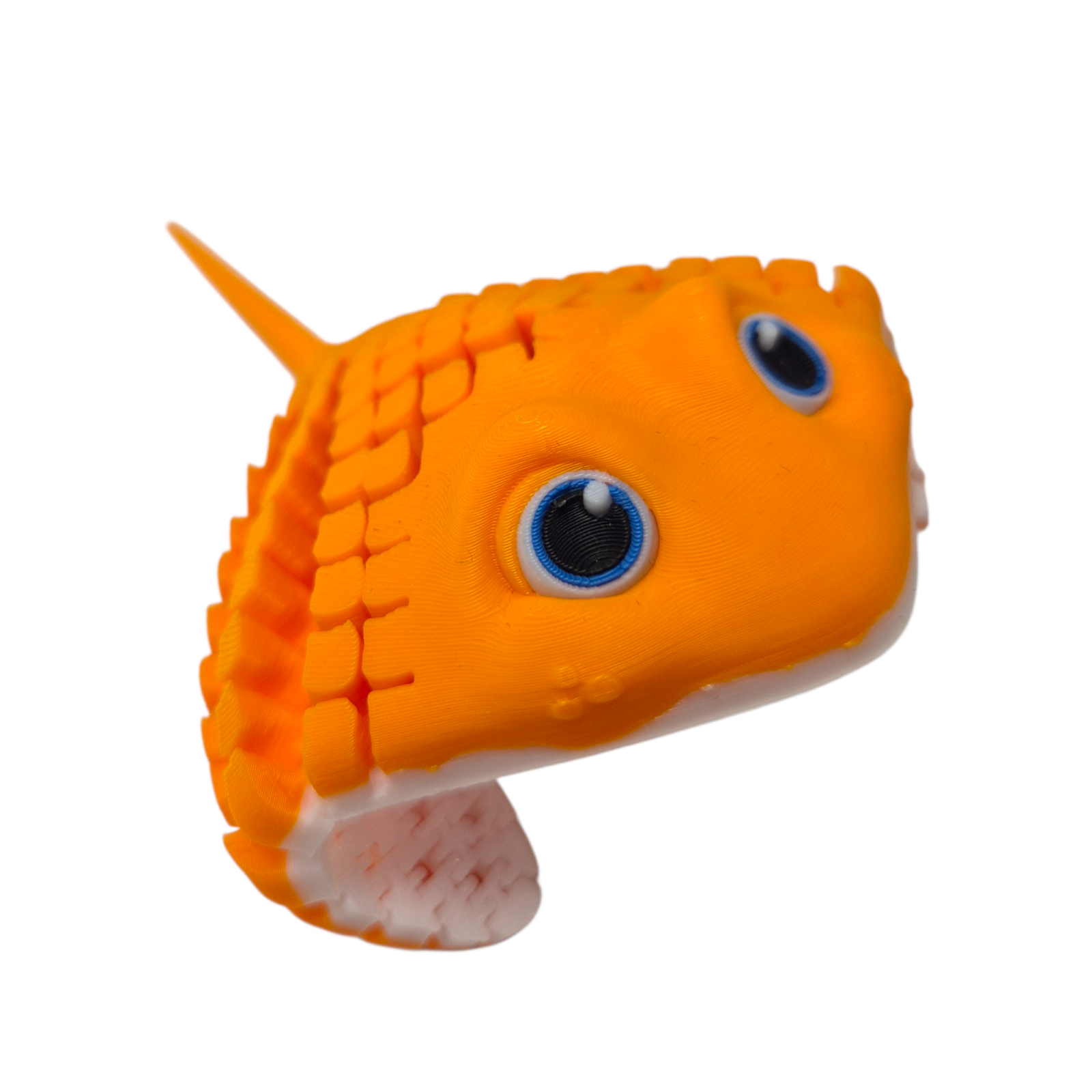Setul Pisică de Mare – Mama Albastră cu cei doi pui portocaliu și verde aduce împreună trei figurine printate 3D, articulate, create pentru jocuri imaginare și explorări acvatice. Modelele sunt lucrate în PLA, un material biodegradabil, sigur pentru copii și durabil în utilizare. Fiecare piesă este segmentată astfel încât înotătoarele și corpul să se miște natural, imitând modul în care alunecă pisicile de mare prin apă. Mama are dimensiuni mai mari, cu detalii de solzi și accentuări albe, iar puii sunt versiuni compacte, ușor de manevrat de copii.