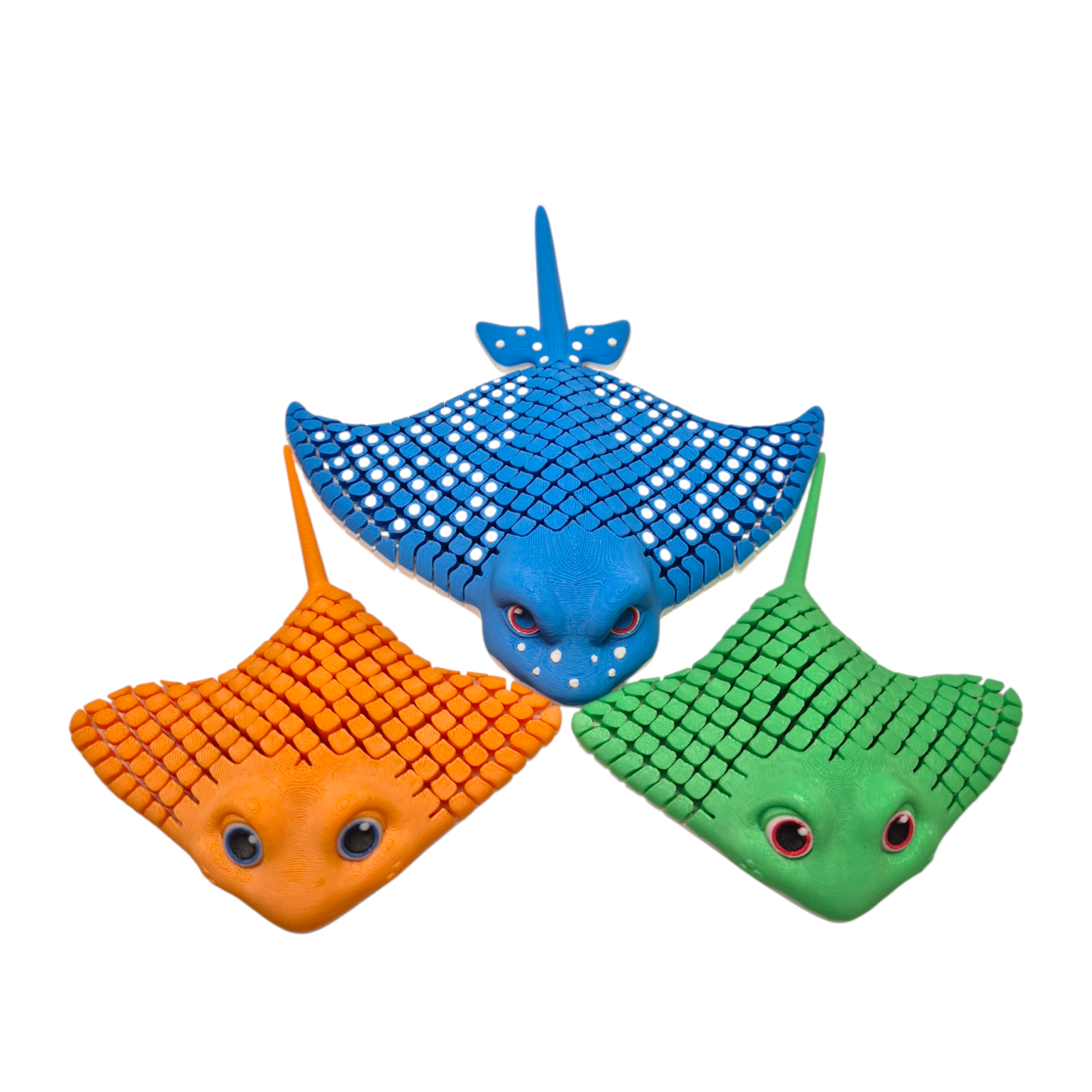 Setul conține trei pisici de mare articulate: mama albastră și doi pui, unul portocaliu și unul verde. Fiecare jucărie este printată 3D în PLA și are corp flexibil format din segmente mobile. Modelele sunt ușoare, plăcute la atingere și pot fi manevrate în multe poziții, ceea ce le face atractive pentru jocuri imaginative. Culorile vii și detaliile de pe carapace dau un aspect realist fără a complica designul. Puii au aceeași formă de bază, dar dimensiuni reduse.